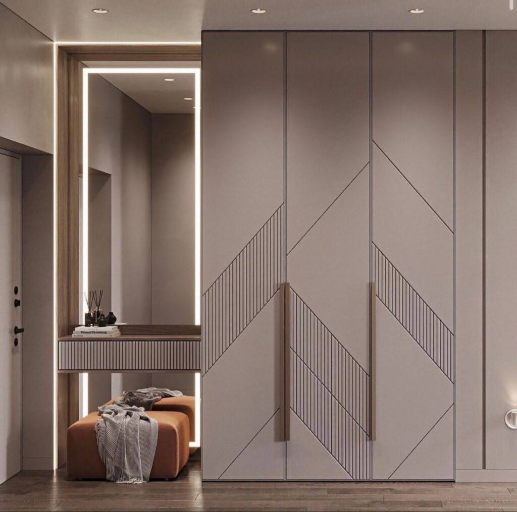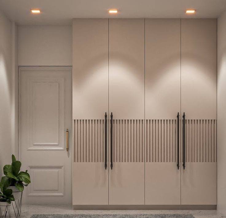 If you want your wardrobe to double as a design statement, pivot doors are a striking option. Instead of swinging on side hinges, these rotate on a central pivot, giving them a modern architectural edge.